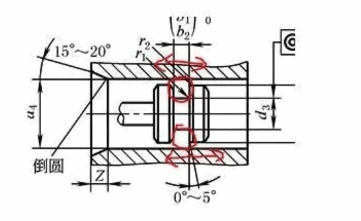 轴向密封是密封特征分布在沿轴的方向的。如下图,红圈为密封件,可以简单的认为是O圈。红色箭头表示流体运动方向,可以看出是限制流体径向运动。